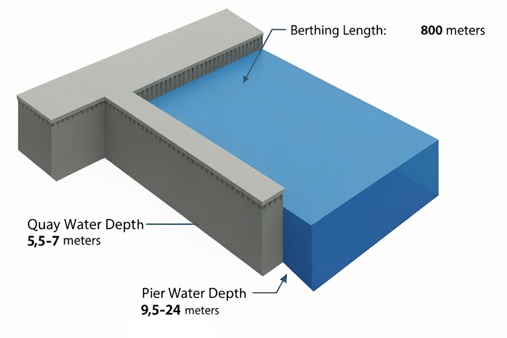 225 meters long with a total of 800 meters of berthing space and a water depth between 9.5-24 meters. There are ramps on both sides of the quay, each 20 meters wide and 1.5 meters above sea level, which can be used by Ro-Ro vessels.